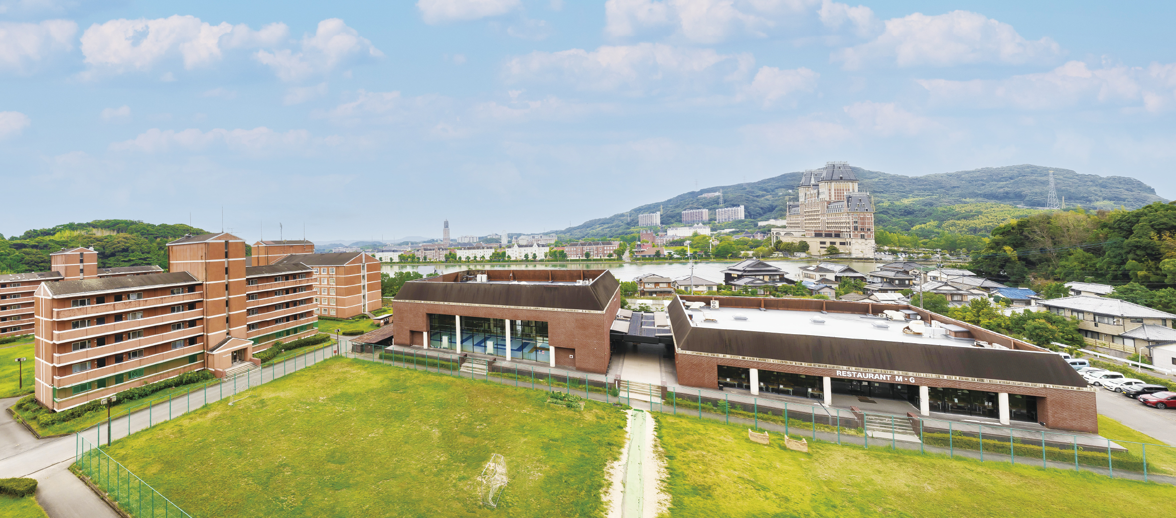 天然芝のグラウンドはサッカーができる十分な広さがあり、 放課後は学生たちの憩いの場となっています。また、バーベキュー用の設備も揃っており、集まりやイベントにも利用できます。