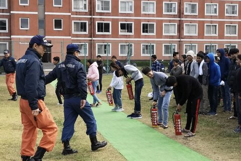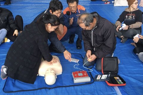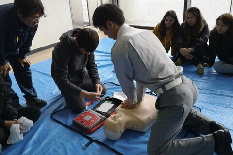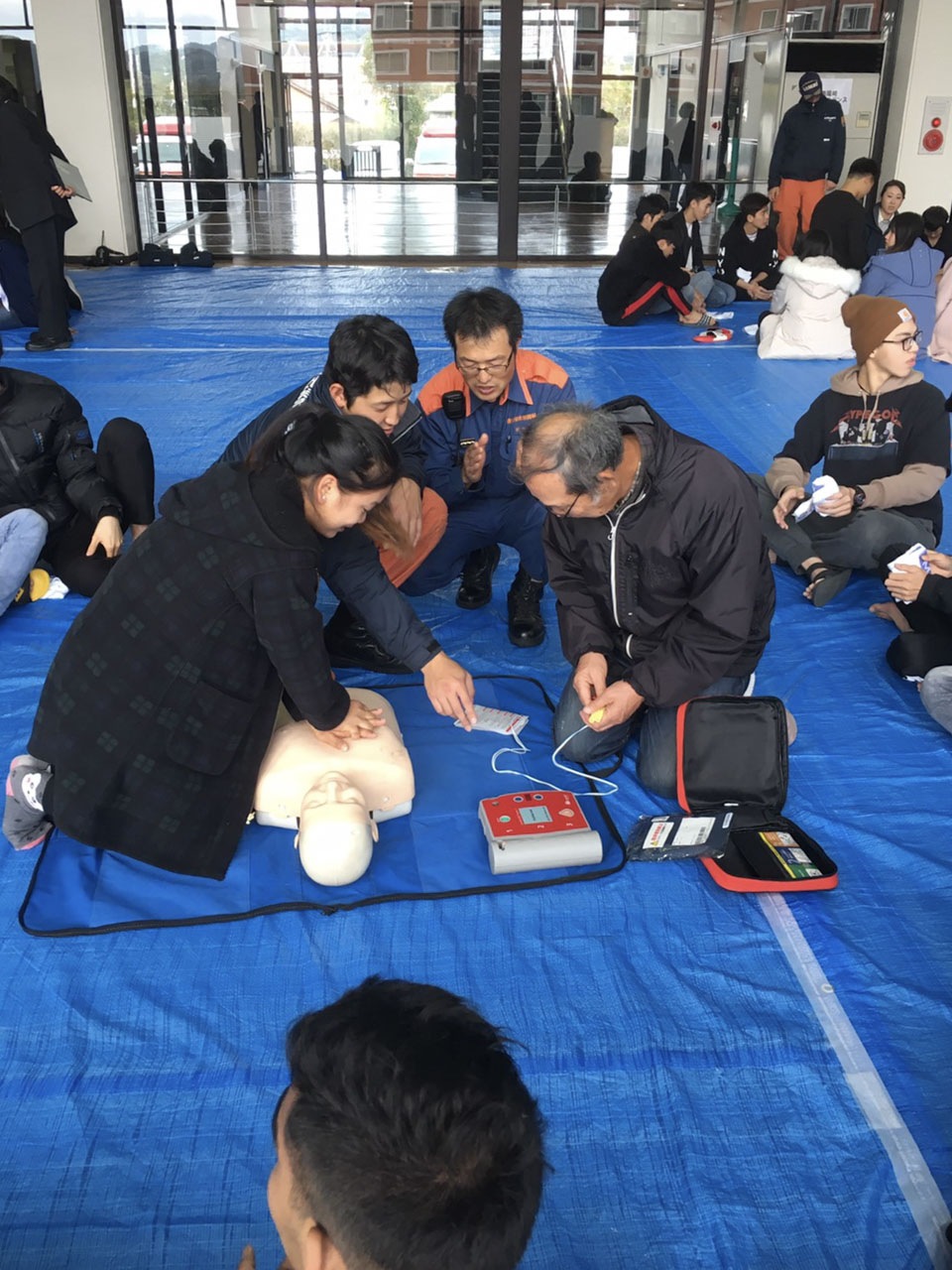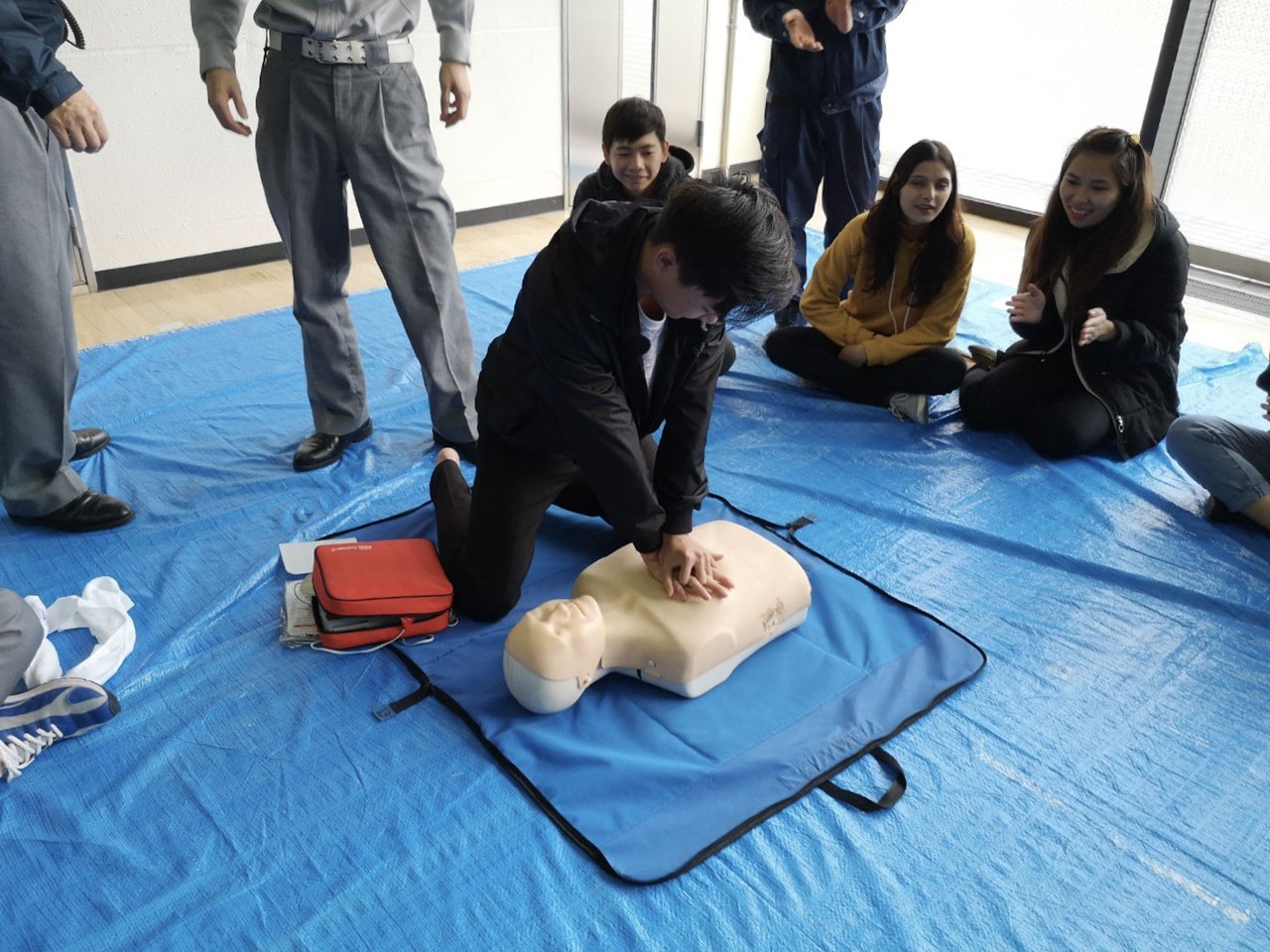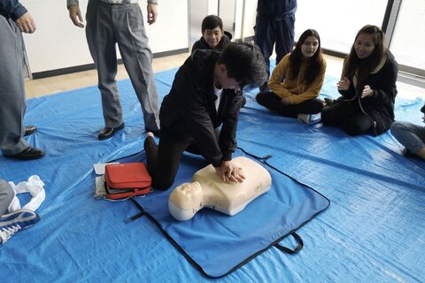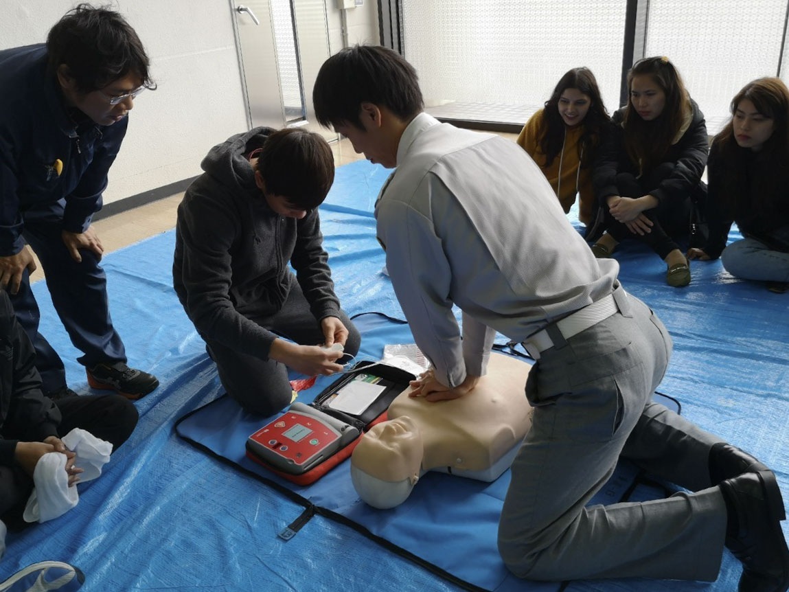 避難練習のあとは、心臓マッサージのやり方、AED、消火器の使い方を学びました。