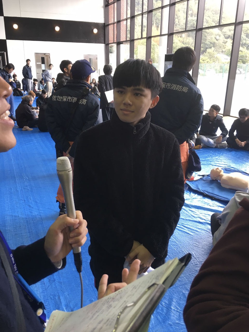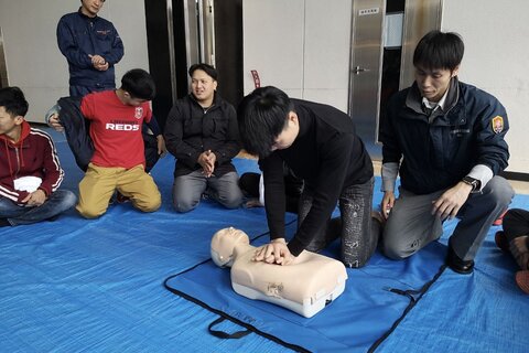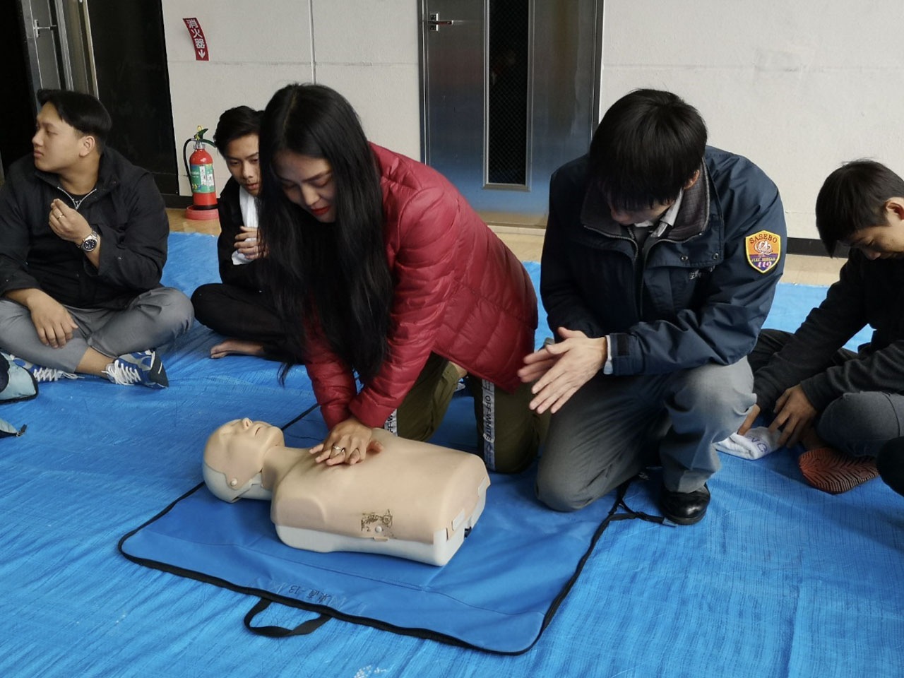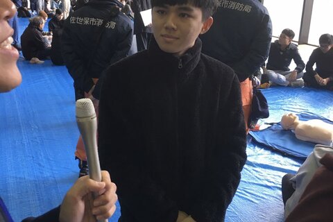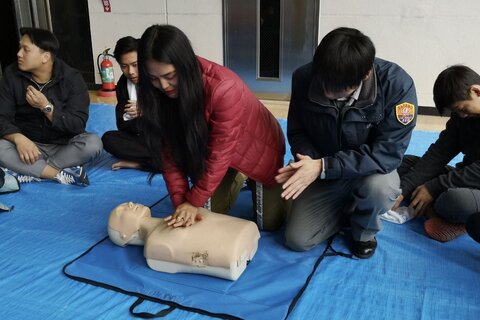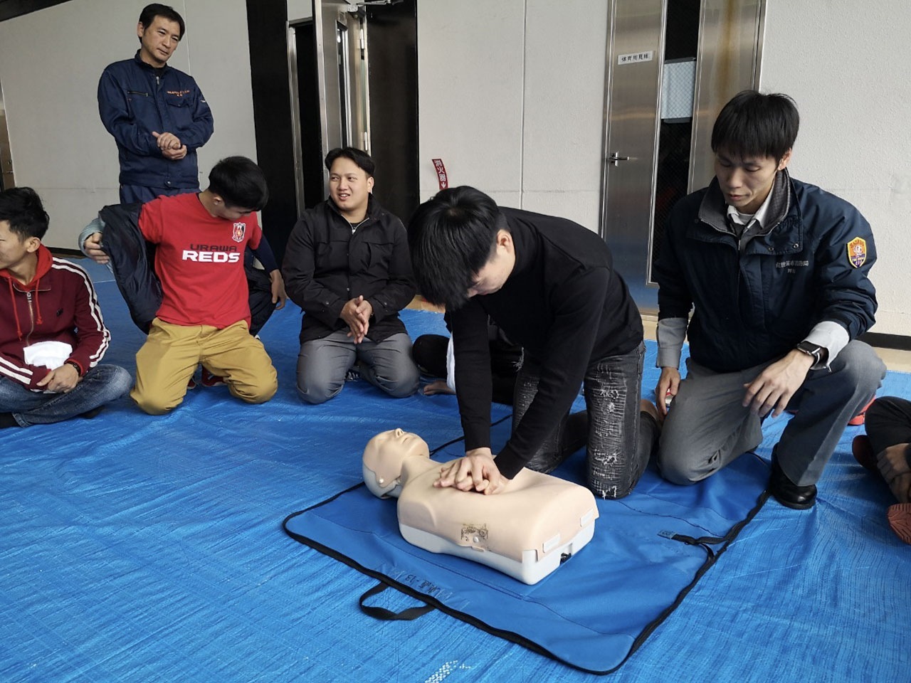 避難練習のあとは、心臓マッサージのやり方、AED、消火器の使い方を学びました。