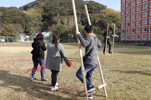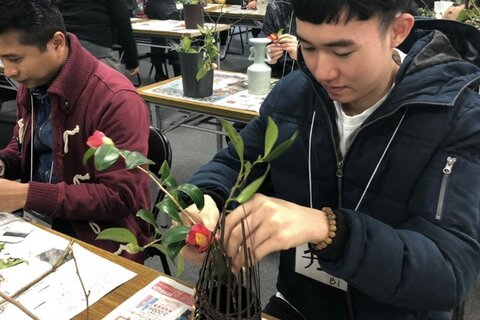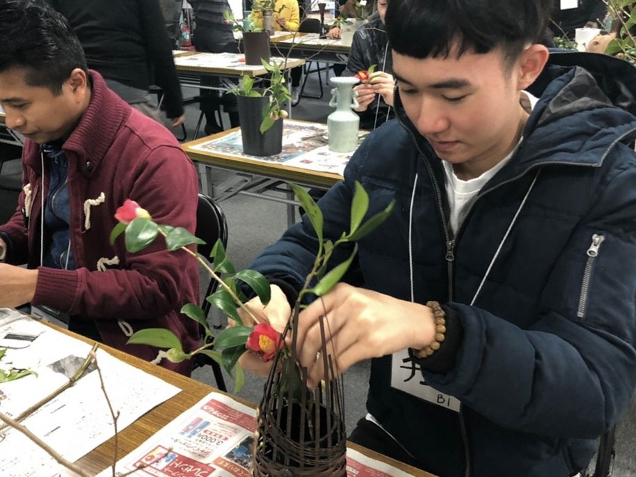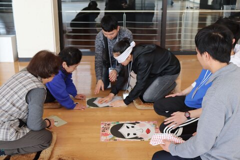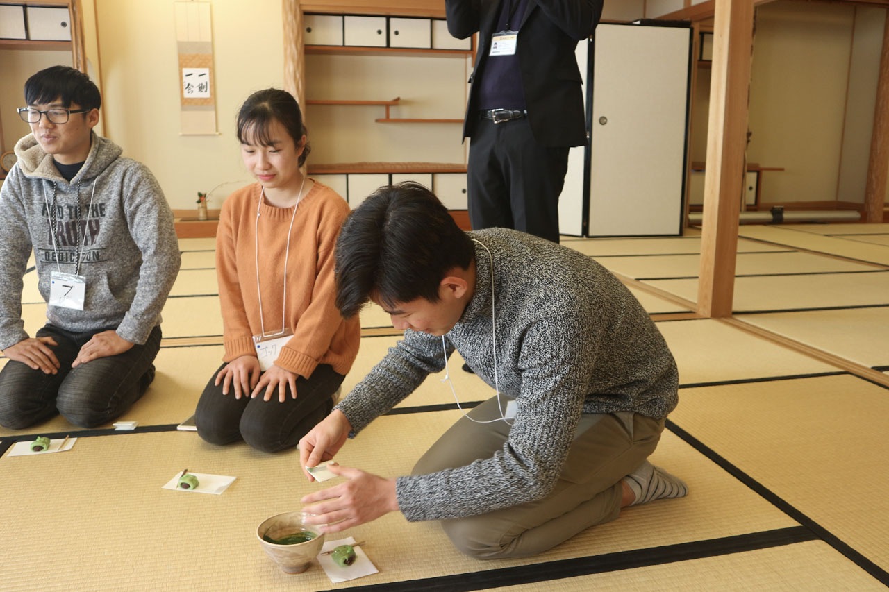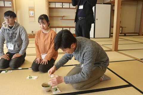 日本文化体験ということで、学生たちが3グループに分かれて、昔遊び・茶花・茶道を体験しました。