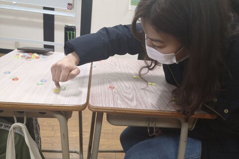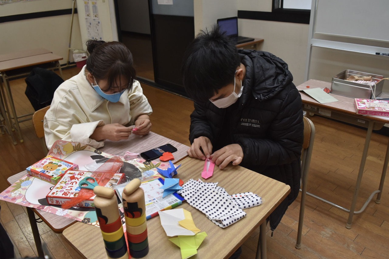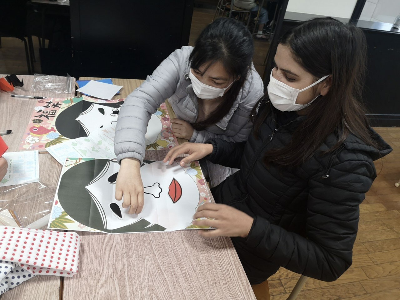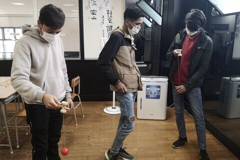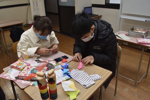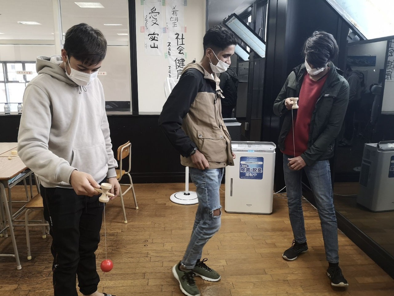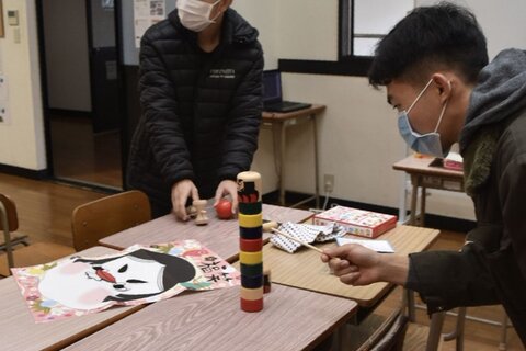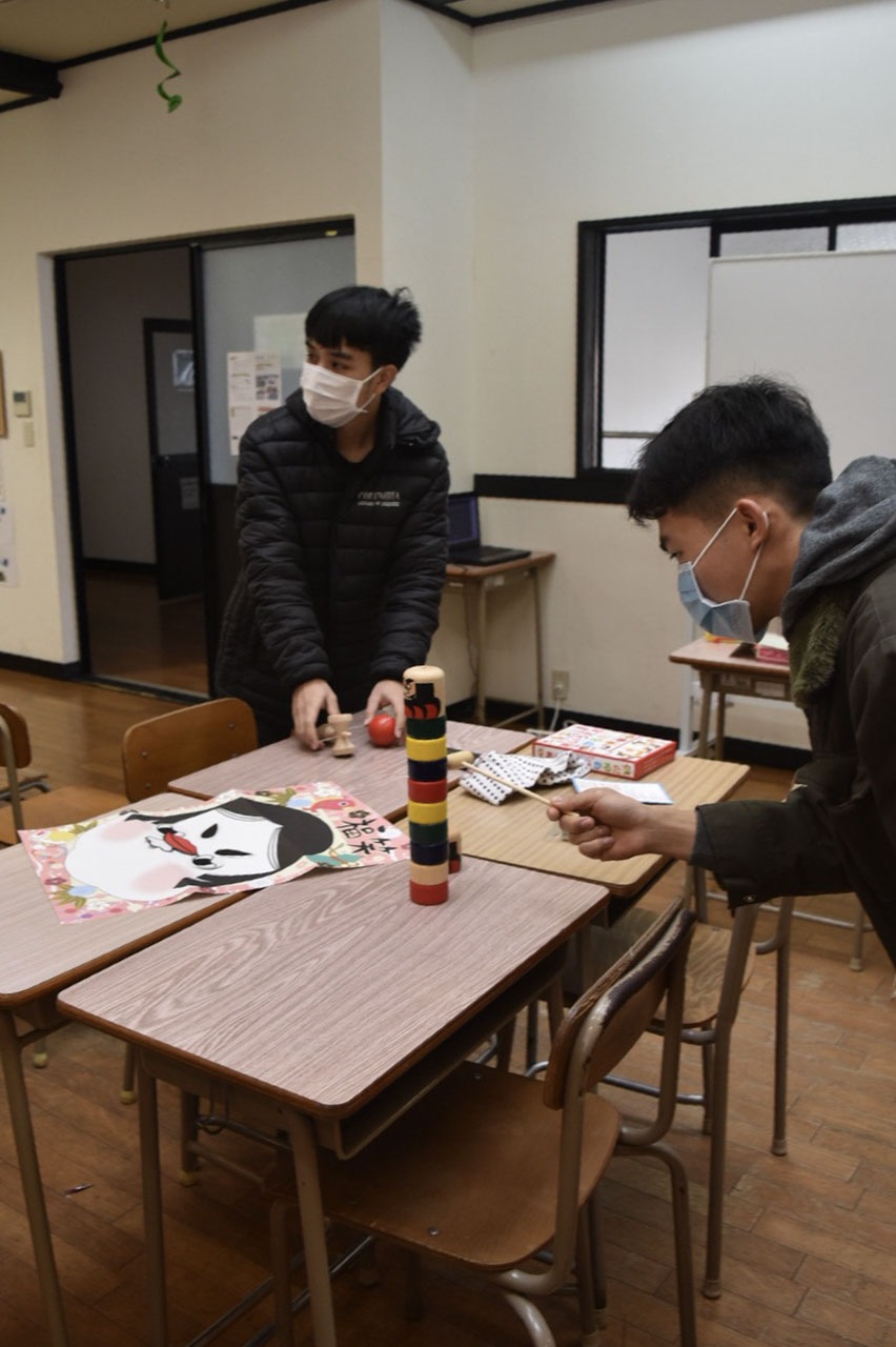 けん玉やカルタ、だるま落とし、福笑いなどで遊んで、