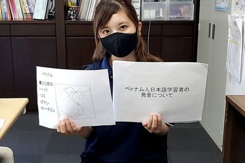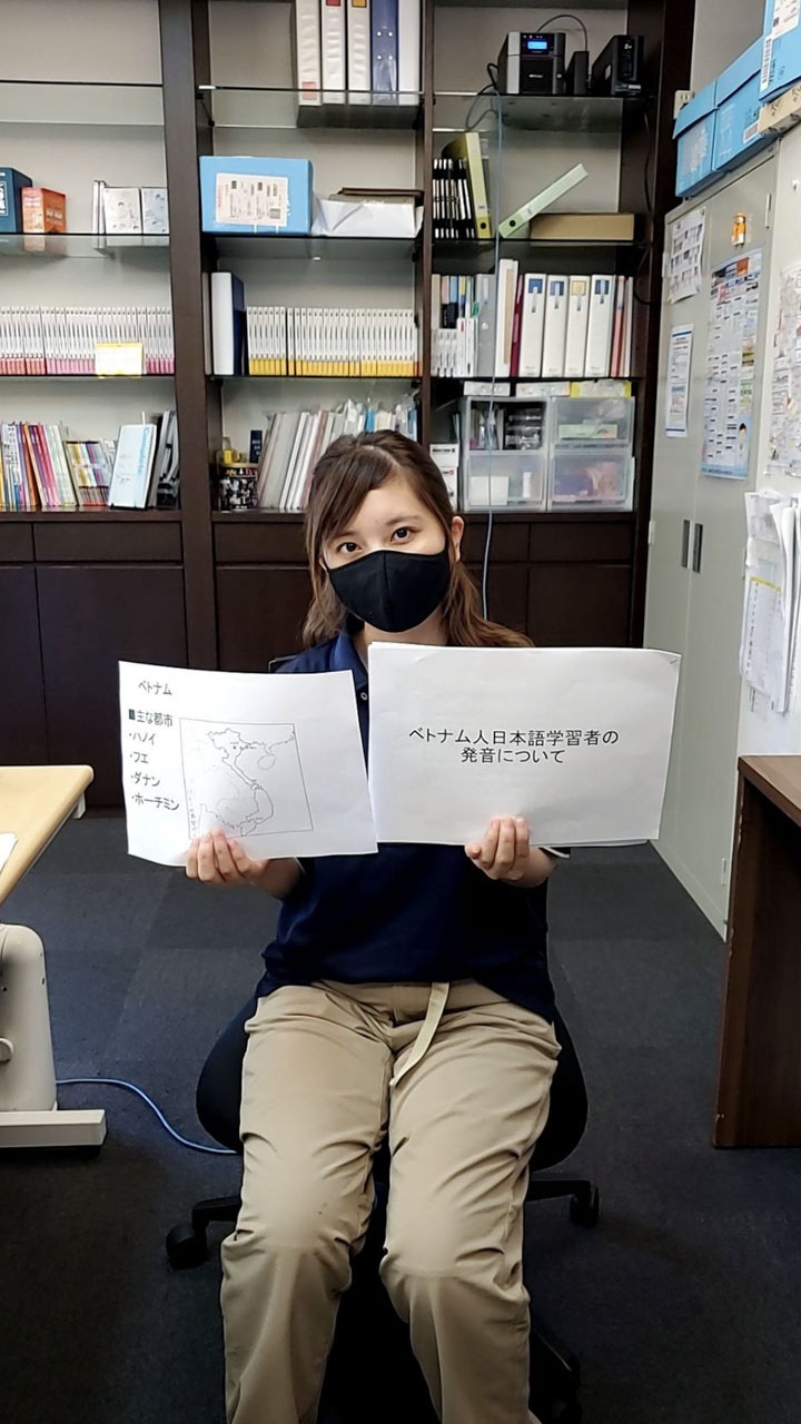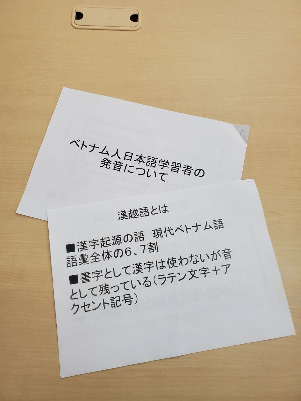担当は学生支援課 Vyさん、テーマは「ベトナム人学習者について」でした。「コミュニケーションに尻込みしやすく、発音が苦手な学習者に自信を持たせたい」姉心から「発音について」の発表と、上級に行けば行くほど学びやすくなるヒントになる「漢越語」の研究発表でしたが、自分自身が苦労して学習してきた2つの研究は研究者顔負けのもので、教授法のヒントになるものでした。