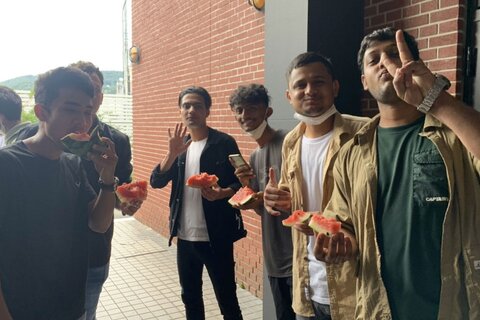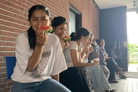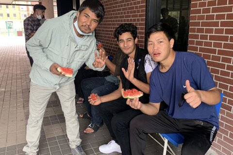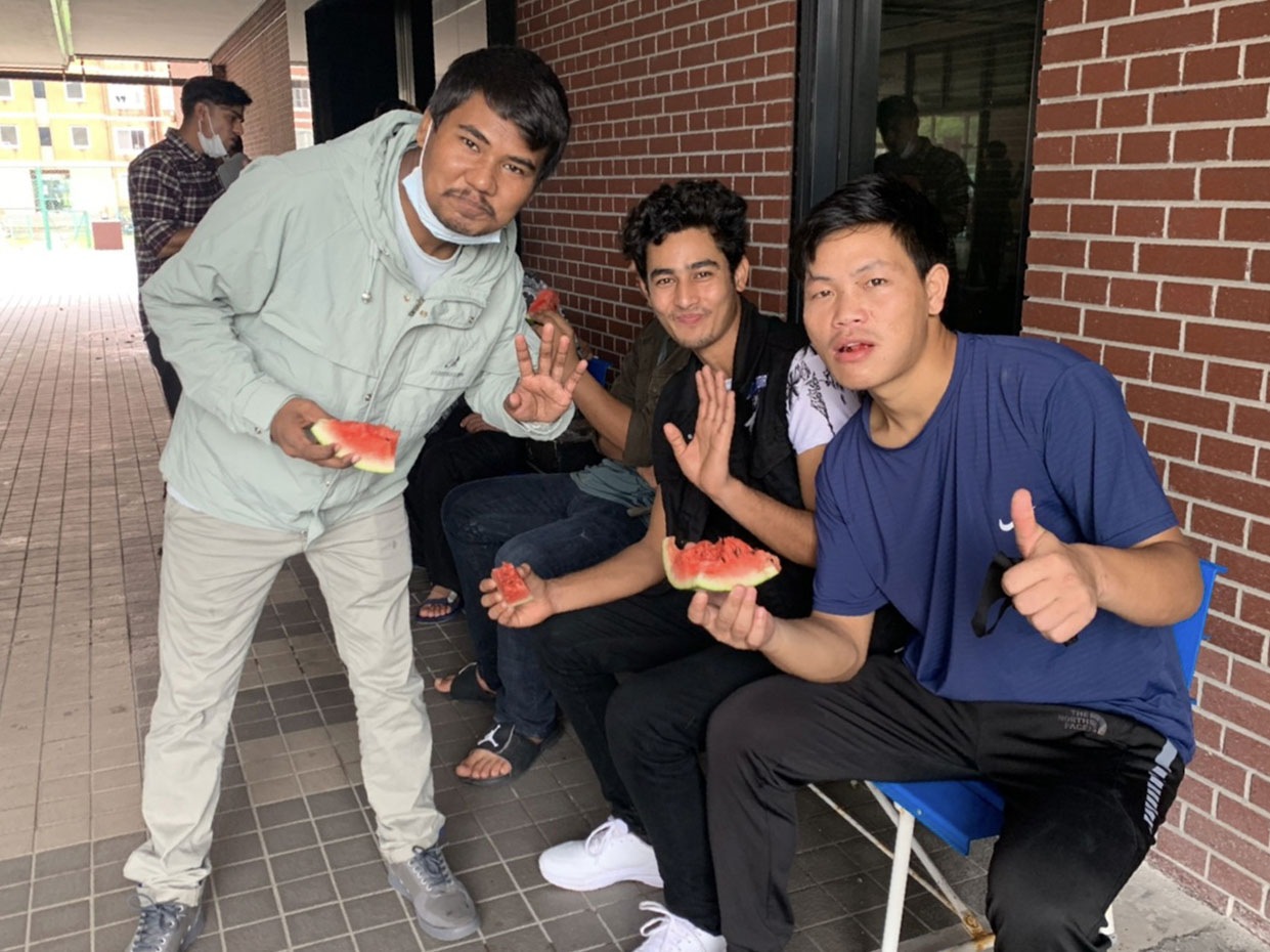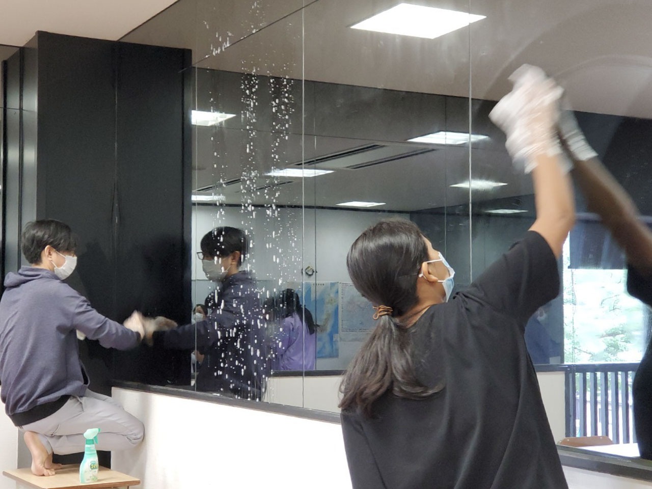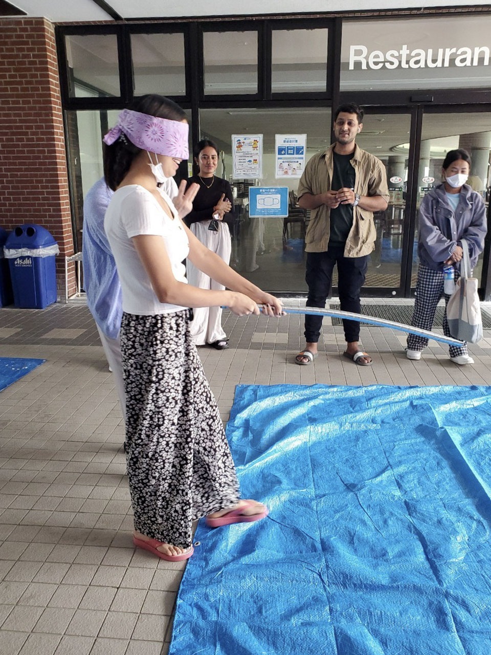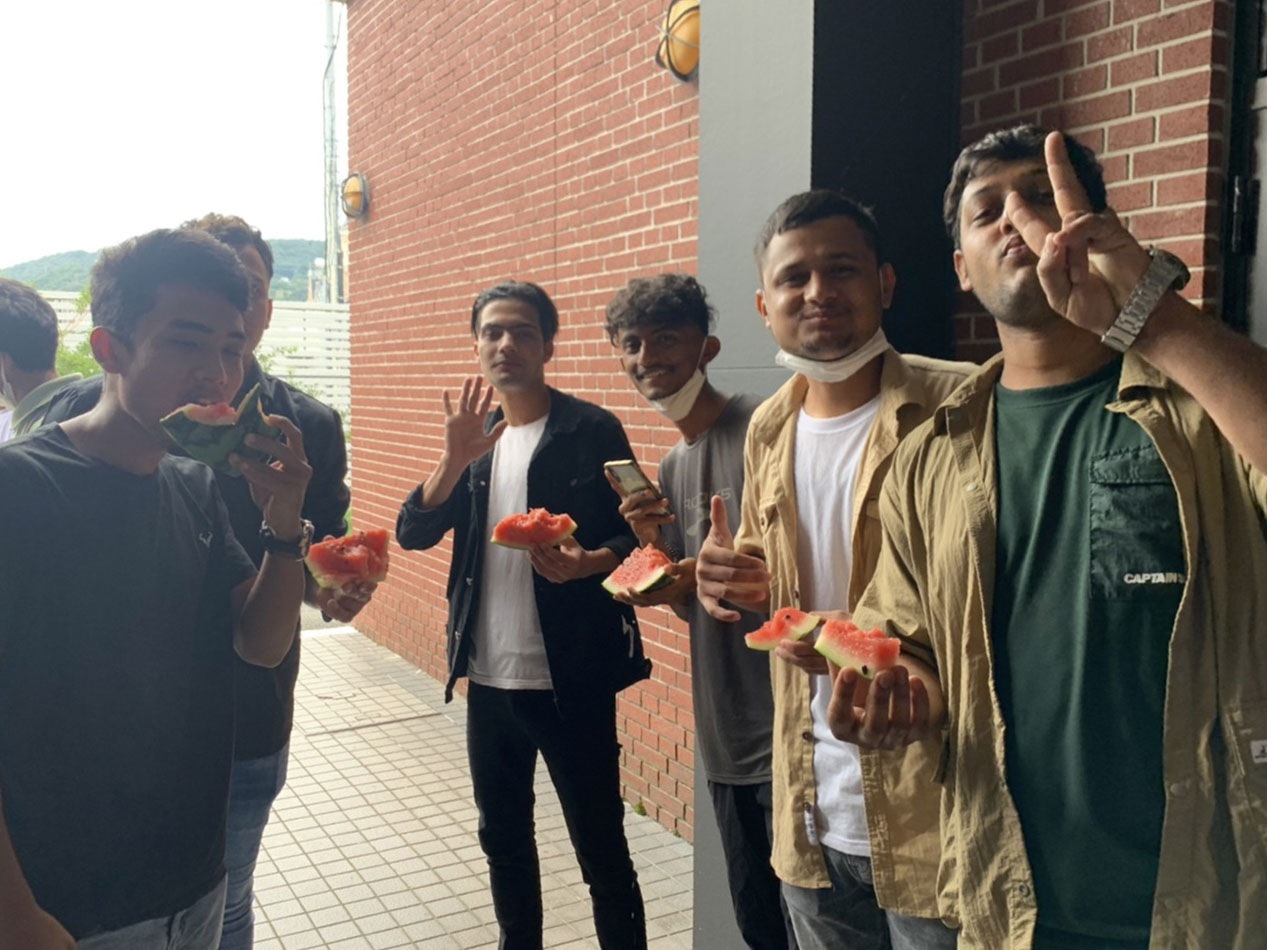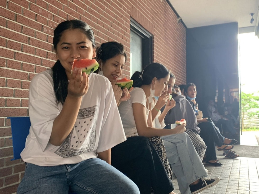 掃除の後は、夏の風物詩『スイカ🍉割り』を行いました。