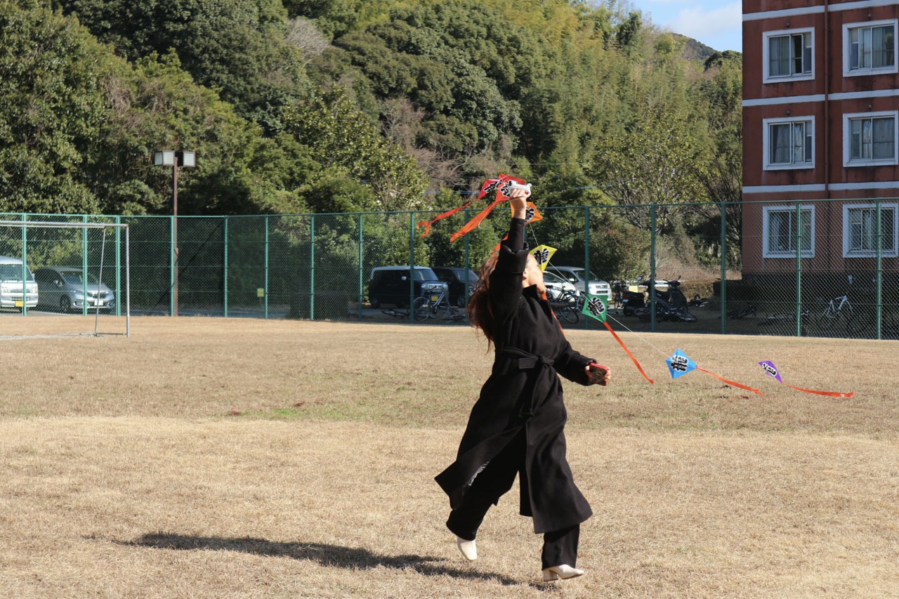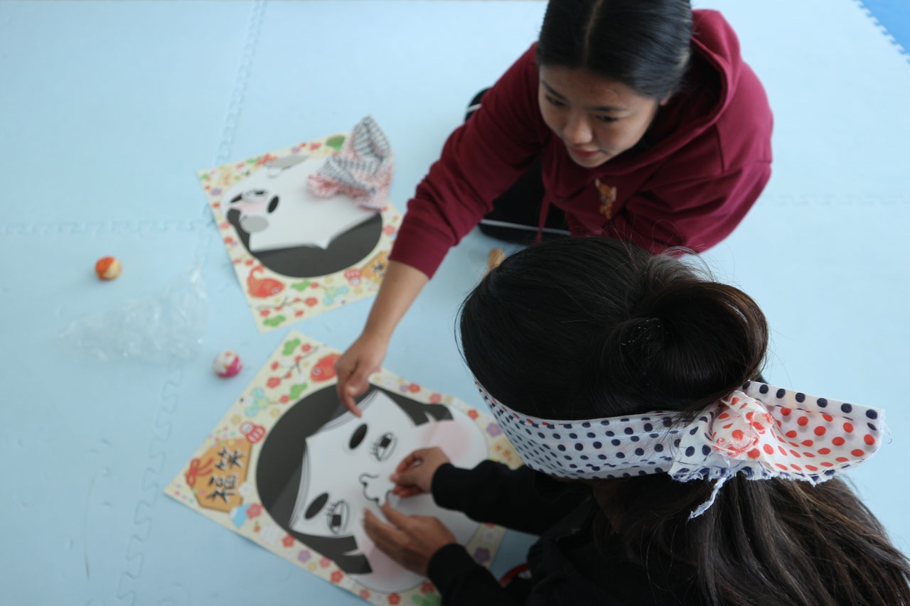室内にて「寿司体験」「福笑い」「お手玉」「けん玉」「かるた」「羽根つき」「浴衣体験」を行い、グラウンドにて「竹馬」「連凧」を行いました。