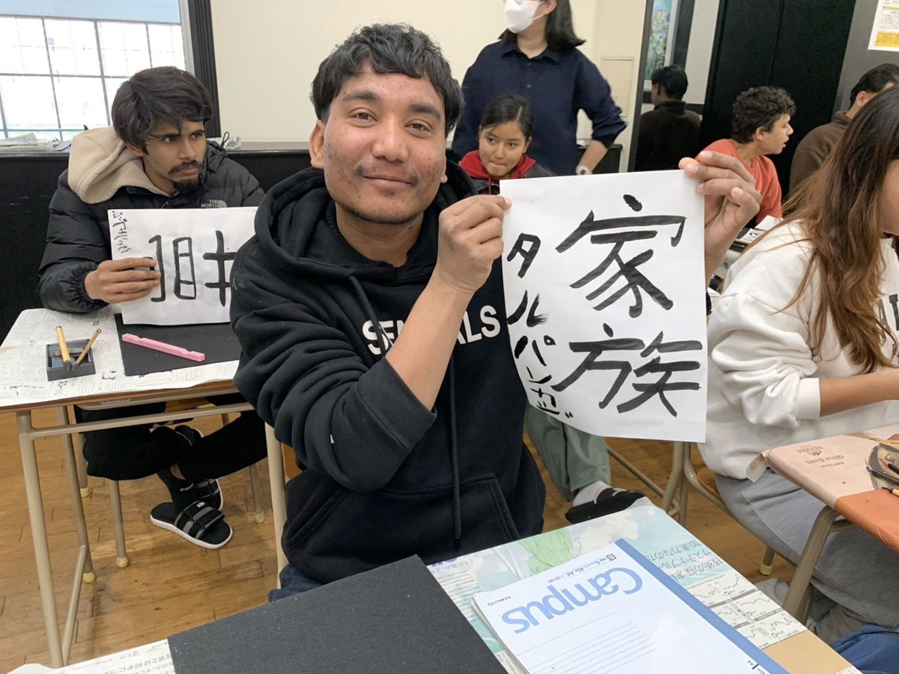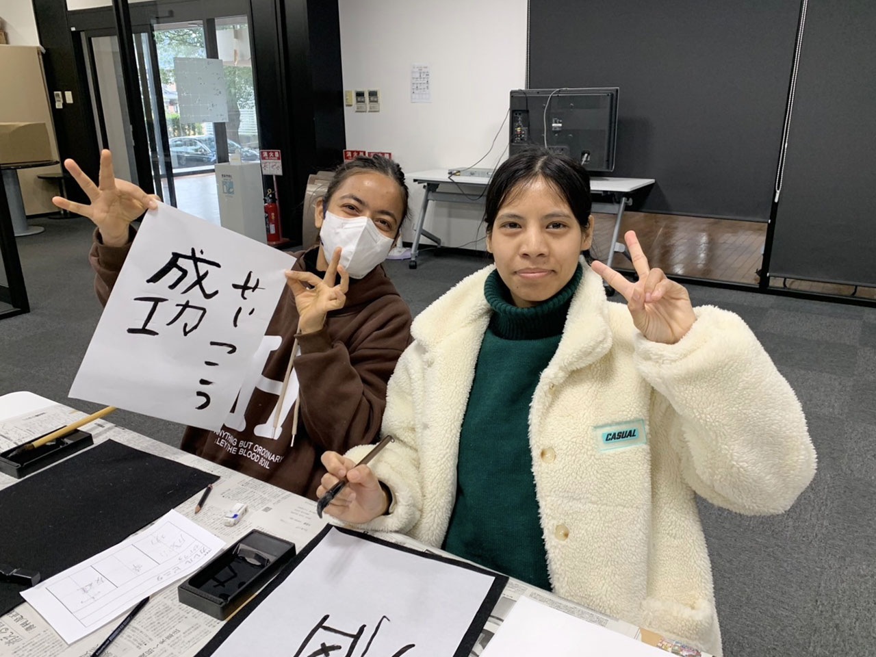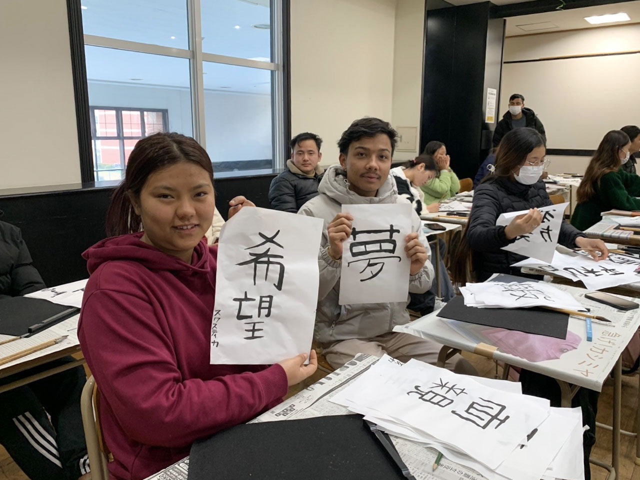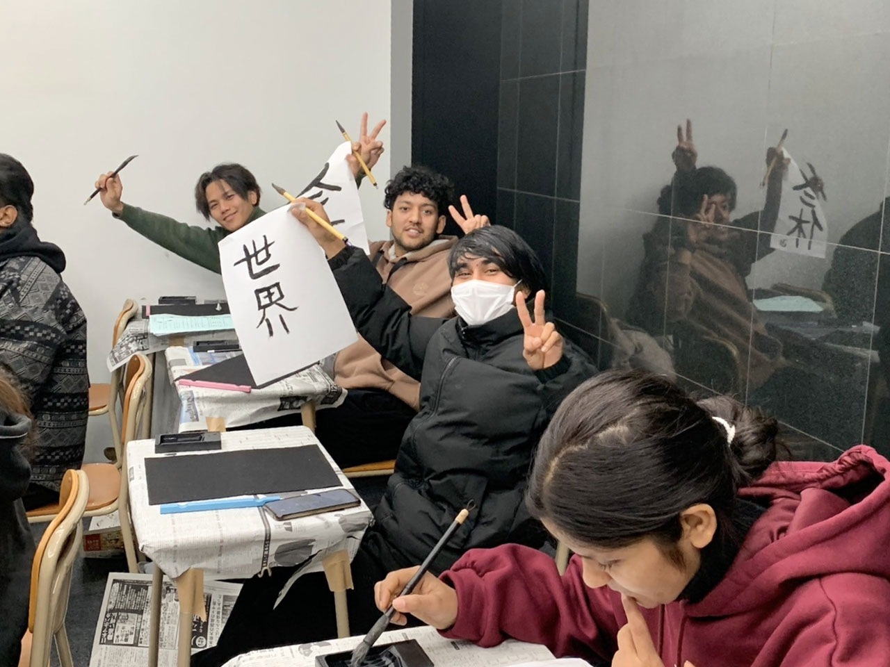 その後、各教室に移動し、新年最初のイベント「書初め」を行いました。新年の抱負、大切な人、好きな漢字など各々、好きな言葉を自由に書きました!