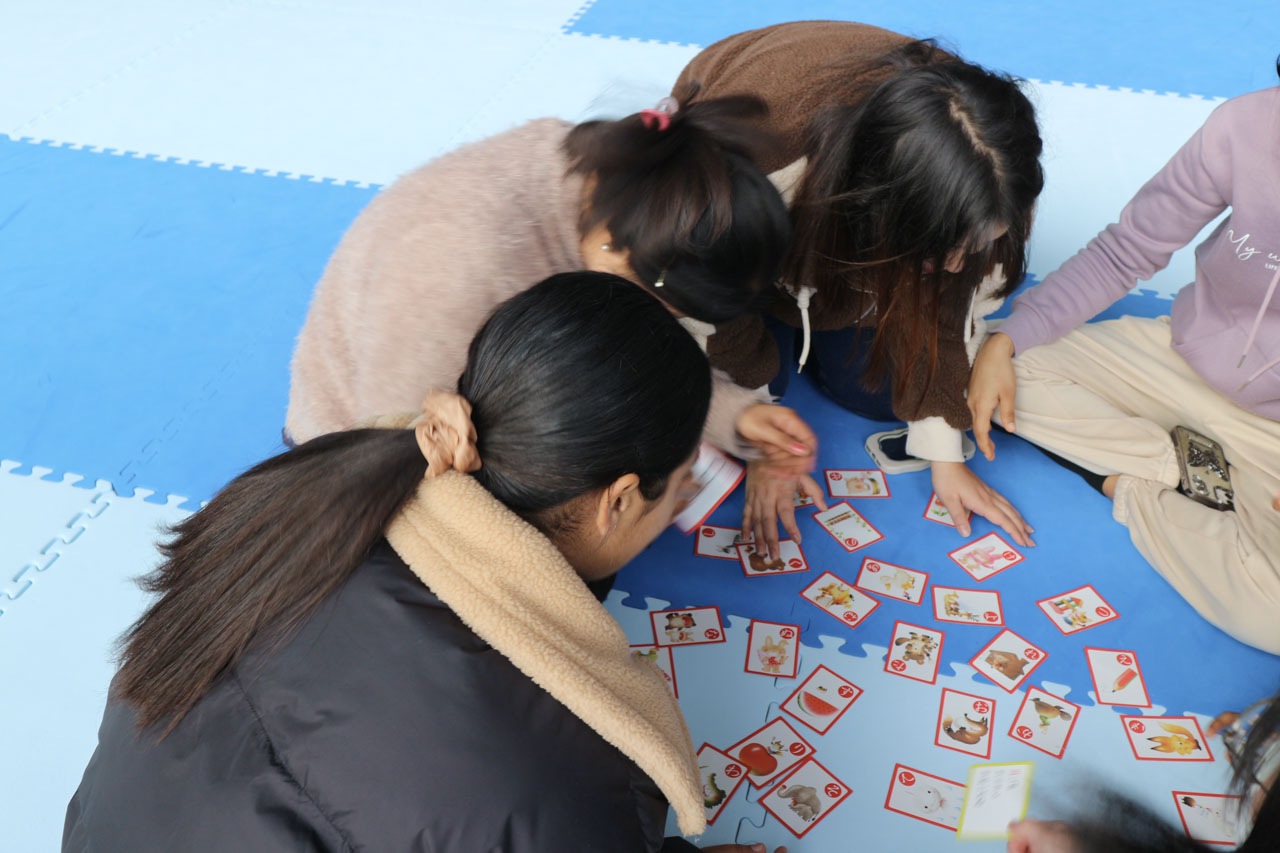 『昔遊び体験』福笑い・お手玉・けん玉・かるた・羽根つき、竹馬・連凧で遊びました。