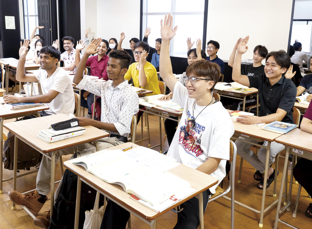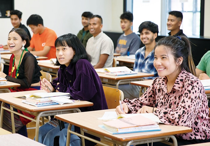 留学生たちが、隣接する長崎国際大学の階段教室で笑顔で学んでいる様子